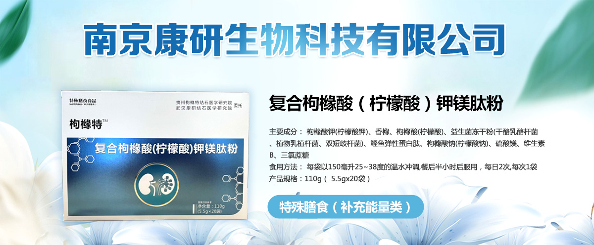復(fù)合枸緣酸(檸檬酸)鉀鎂肽粉,特膳食品,全國控銷,適合結(jié)石手術(shù)前后服用,禁掛網(wǎng)! 01產(chǎn)品來源 南京康研生物科技有限公司是一家專注于泌尿系結(jié)石研究、從事醫(yī)學(xué)特殊膳食研發(fā)及醫(yī)療器械研發(fā)的企業(yè)。南京康研總部位于南京。于貴州設(shè)立貴州構(gòu)櫞特結(jié)石醫(yī)學(xué)研究院,在武漢設(shè)立武漢康研結(jié)石醫(yī)學(xué)研究院,聘請多位醫(yī)學(xué)專員對泌尿系結(jié)石領(lǐng)域進行臨床