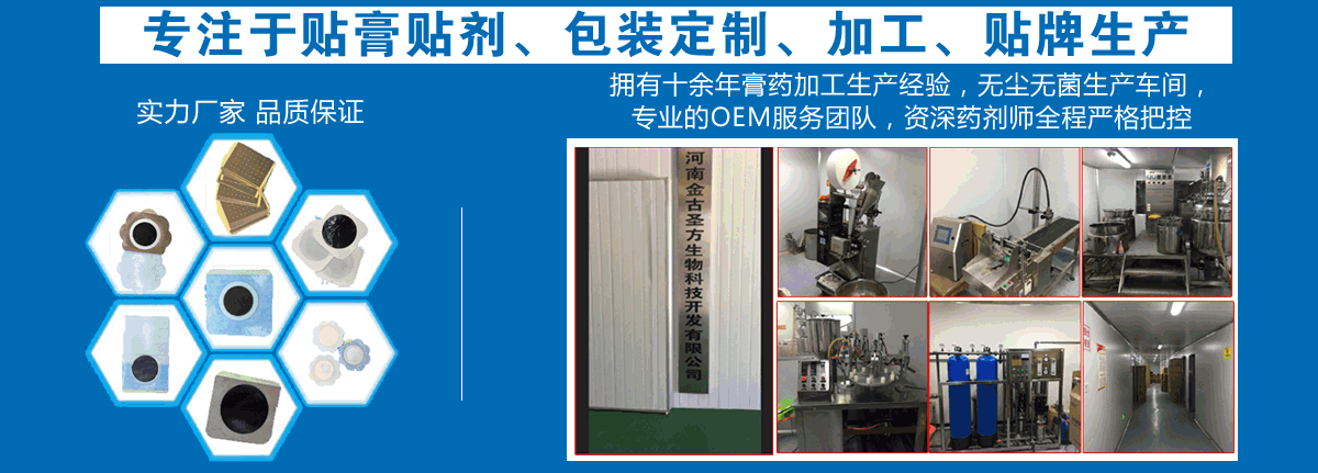 金古圣方:源頭膏藥貼廠(chǎng)家,可OEM貼牌生產(chǎn),可代理,支持疼痛貼、老黑膏、疼痛膏、小兒貼、蜂蜜貼包裝定 企業(yè)介紹Company profile 金古圣方·外用貼劑一站式服務(wù)企業(yè) 作為傳承配方的代表性企業(yè),鄭州金古圣方藥業(yè)有限公司以弘揚(yáng)中醫(yī)文化,致力百姓健康為己任,為我們帶來(lái)了諸多優(yōu)質(zhì)產(chǎn)品。尤其在小兒外用貼劑的研發(fā)生產(chǎn)方面,也有著不凡的成就。 公司主要生