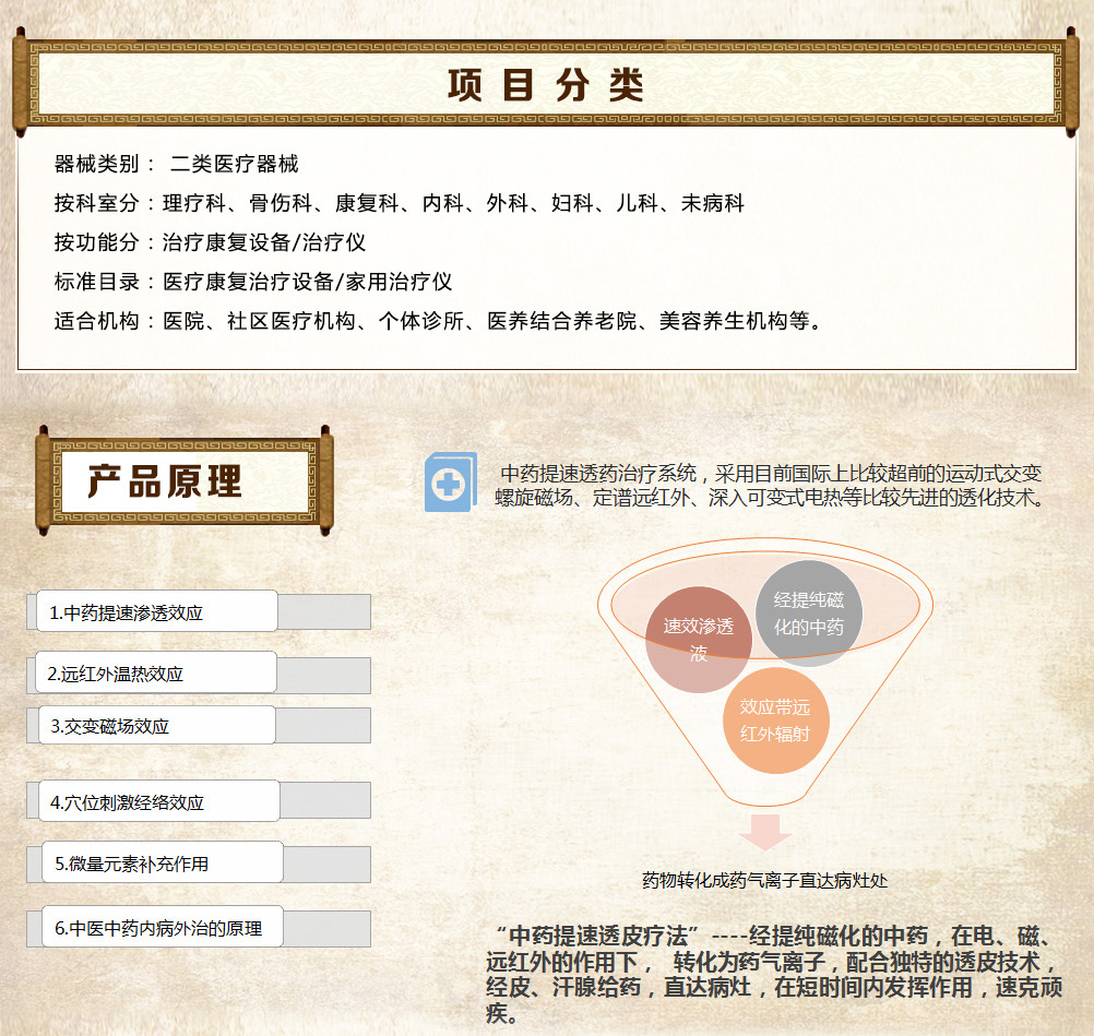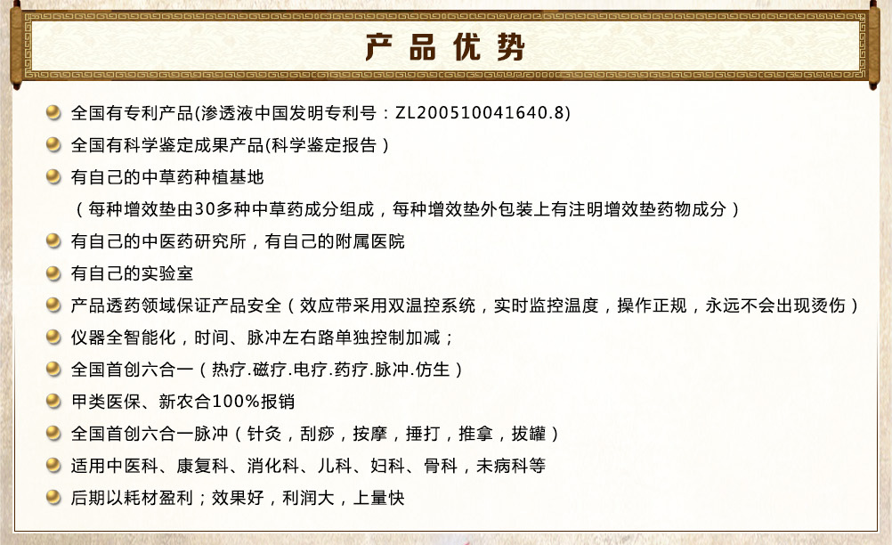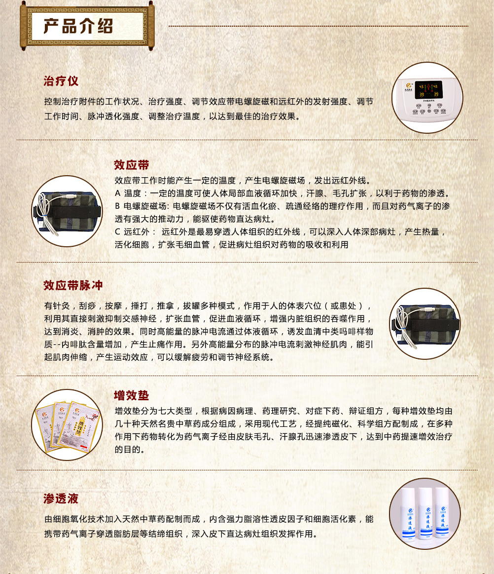 增效墊分為七大類型,根據(jù)病因病理、藥理研究、對(duì)癥下藥、辯證組方,每種增效墊均由幾十種天然名貴中草藥成分組成,采用現(xiàn)代工藝,經(jīng)提純磁化、科學(xué)組方配制成,在多種作用下藥物轉(zhuǎn)化為藥氣離子經(jīng)由皮膚毛孔、汗腺孔迅速滲透皮下,達(dá)到中藥提速增效治療的目的。 |