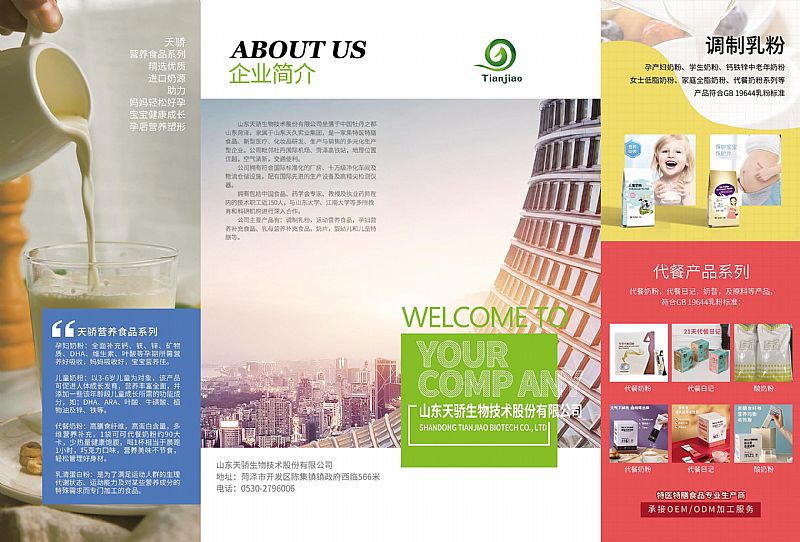 山東天驕生物技術(shù)股份有限公司是一家致力于大健康產(chǎn)品的研發(fā)生產(chǎn)企業(yè),歡迎ODM/OEM 特殊膳食用食品、調(diào)制乳粉及功能性原料,特膳食品包括,孕婦及乳母營養(yǎng)補充食品、運動營養(yǎng)食品、輔食營養(yǎng)補充品;調(diào)制乳粉包括:兒童、學生、中老年、孕婦、家庭乳粉及咖啡、奶茶、烘焙、糖果、蜜餞裹粉、特膳、固體飲料、特醫(yī)食品等用的乳粉原料等。煉乳粉、酸奶粉、芝士粉、干酪粉等產(chǎn)品質(zhì)量穩(wěn)定,口感好,滋氣味濃郁,用于中高端產(chǎn)品。歡迎詢價.