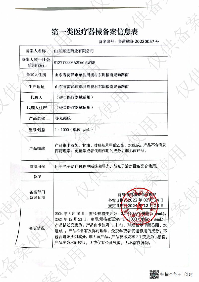 | 補(bǔ)充說(shuō)明 | 【產(chǎn)品名稱】導(dǎo)光凝膠 【型號(hào)規(guī)格】35g/瓶×1瓶/盒 【產(chǎn)品描述】產(chǎn)品由卡波姆、甘油、對(duì)羥基苯甲酸乙酯、水組成。產(chǎn)品不含有發(fā)揮藥理學(xué)、免疫學(xué)或者代謝作用的成分。非無(wú)菌產(chǎn)品。 【預(yù)期用途】用于光子治療過(guò)程中隔熱和導(dǎo)光,與光子治療設(shè)備配合使用。 【使用方法】外用,直接涂抹于患處。 【注意事項(xiàng)】 1、本品不屬于藥品; 2、 本品外用禁口服; 3、過(guò)敏體質(zhì)者慎用; 4、 皮膚有開(kāi)放性傷口、化膿或有明顯滲出者禁用; 5、 請(qǐng)將本品放在兒童不能接觸的地方; 6、 本品性狀發(fā)生改變時(shí)禁止使用; 7、 使用本品后有不適癥狀者應(yīng)停止使用或向醫(yī)生咨詢。 【禁忌癥】對(duì)本品成分過(guò)敏者禁用。 【儲(chǔ)存條件】密封、常溫下貯存和運(yùn)輸,運(yùn)輸過(guò)程中輕拿輕放。 【備案憑證編號(hào)】魯菏械備20220057號(hào) 【產(chǎn)品技術(shù)要求編號(hào)】魯菏械備20220057號(hào) 【生產(chǎn)備案憑證編號(hào)】魯菏食藥監(jiān)械生產(chǎn)備20170002號(hào) |