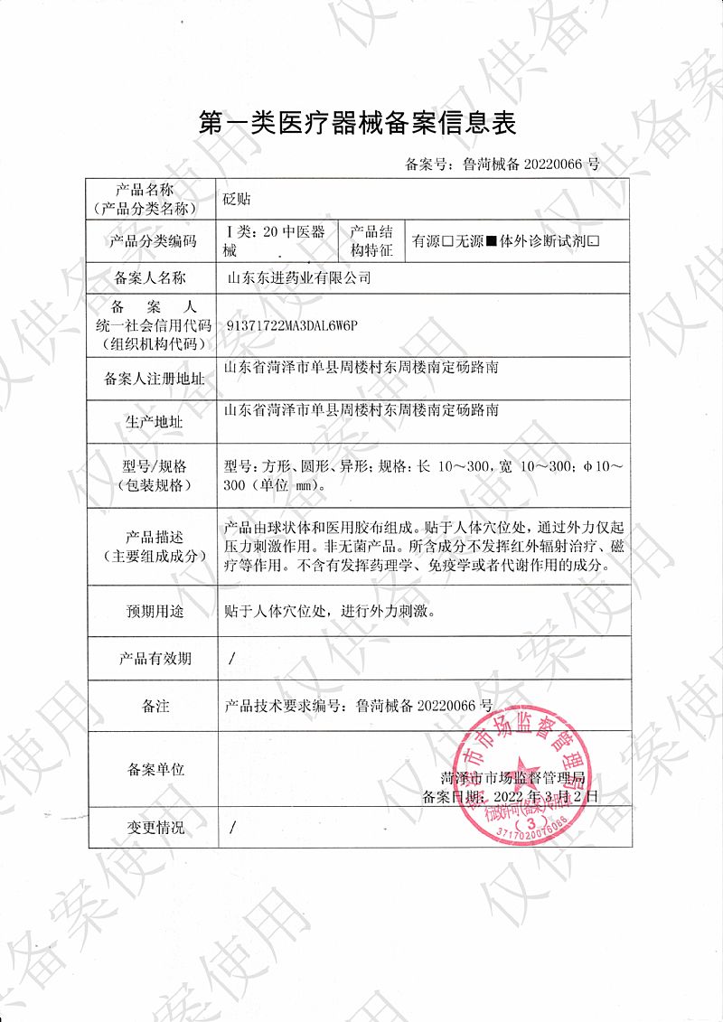 | 補充說明 | 【產(chǎn)品名稱】砭貼 【型 號】方形 【規(guī) 格】70mm×100mm×5 貼/袋×100袋 【產(chǎn)品描述】產(chǎn)品由球狀體和醫(yī)用膠布組成。貼于人體穴位處,通過外力僅起壓力 刺激作用。非無菌產(chǎn)品。所含成分不發(fā)揮紅外輻射治療、磁療等作用。 不含有發(fā)揮藥理學(xué)、免疫學(xué)或者代謝作用的成分。不包含附錄所列成分。 【預(yù)期用途】貼于人體穴位處,進行外力刺激。 【使用方法】 1、清潔相應(yīng)穴位,先以拇指依次揉按相應(yīng)穴位,每穴1~2分鐘,范圍由 小到大,力量由輕到重,探尋敏感點。 2、確認(rèn)包裝無破損后,打開包裝,取出砭貼,將貼劑的隔離膜撕去,對準(zhǔn)相應(yīng)穴位敏感點貼壓,1片/穴、天,每日適度按壓3~5次,每次3~5分鐘。 【注意事項】 1、僅限一次性使用,用后銷毀; 2、叮囑患者定時按壓,按壓不能過度用力,以不損傷皮膚為宜; 3、無粘性、包裝破損或過有效期禁止使用; 4、夏季多汗,宜勤換; 5、敷貼后如有過敏等不適,應(yīng)停止敷貼; 6、本品不屬于藥品。 【慎 用】糖尿病、高熱患者慎用。 【禁忌癥】孕婦、皮膚潰爛處禁用,對本品成分過敏者禁用。 【儲存條件】本產(chǎn)品應(yīng)貯存在相對濕度不超過80%,無腐蝕性氣體、陰涼、干燥、通風(fēng) 良好、清潔的環(huán)境內(nèi)。 【備案憑證編號】魯菏械備20220066號 【產(chǎn)品技術(shù)要求編號】魯菏械備20220066號 【生產(chǎn)備案憑證編號】魯菏食藥監(jiān)械生產(chǎn)備20170002號 |