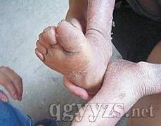 4、皮膚癥狀:皮膚潮紅,中毒1~3天后可有不同程度的脫皮,從口周及鼻唇間延及全身,呈鱗屑狀至大片狀脫皮,并有色素沉著,頭發(fā)及汗毛脫。因奇癢皮膚常有搔痕。