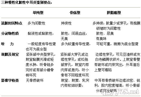 三、診斷要點:慢性化膿性中耳炎包括鼓膜的穿孔,中耳腔的活動性感染,病程持續(xù)數(shù)周或更長。感染時膿液可很多,流出耳道,或很少僅可通過耳內(nèi)鏡或顯微鏡才可發(fā)現(xiàn)。這類疾病常見于咽鼓管功能不佳的患者,聽力下降是常見的癥狀。按照傳統(tǒng)的中耳炎的分型,由于各類慢性化膿性中耳炎在預(yù)后及處理原則上不同,因此還必須在結(jié)合體格檢查、影像學(xué)檢查等,對病變的類型作出明確診斷。三種慢性化膿性中耳炎鑒別要點: