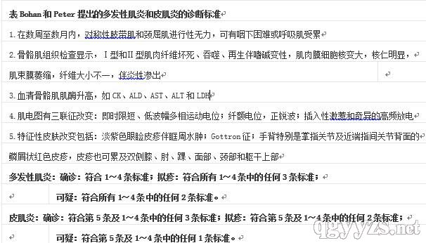 三、診斷要點:根據(jù)患者對稱性近端肌肉無力、疼痛和觸痛,伴特征性皮膚損害如以眶周為中心的紫紅色水腫性斑,Gottron征和甲根皺襞僵直擴張性毛細血管性紅斑,一般診斷不難,再結(jié)合血清肌漿酶和CPK、LDH、AST、ALT和醛縮酶的增高,必要時結(jié)合肌電圖的改變和病變肌肉的活組織檢查,可以確診本病。被多數(shù)臨床醫(yī)生采納的仍是1975年Bohan和Peter提出的診斷標(biāo)準(zhǔn)表。