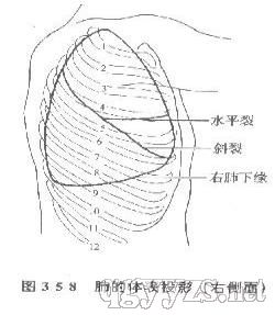 四、肺和胸膜的體表投影:氣管自頸部正中沿食管前方下行進(jìn)入胸部,在胸骨角水平分為左右主支氣管。支氣管粗短而陡直,左主支氣管細(xì)長而傾斜。肺的體表投影見圖。