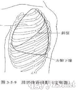 5、肺 下 界:左右兩側(cè)肺下界的位置基本相似。前胸部的肺下界始于第6 肋骨,向兩側(cè)斜行向下,于鎖骨中線處達(dá)第6 肋間隙,至腋中線處達(dá)第8 肋間隙。后胸壁的肺下界幾乎呈一水平線,于肩胛線處位于第10 肋間隙水平。