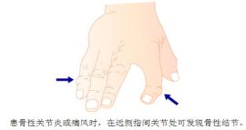 2、赫別登結(jié)節(jié):多見于指末節(jié)指關(guān)節(jié)兩側(cè),2~4cm大小,堅硬,無移動性,有壓痛,發(fā)展緩慢,以后可致使指關(guān)節(jié)向一側(cè)偏斜,但對指功能影響不大。此征可見于指骨性關(guān)節(jié)炎。痛風(fēng)的結(jié)節(jié)與此類似。