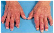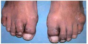 (四)其 他:痛風(fēng)時由于尿酸鹽在關(guān)節(jié)附近的骨骼或滑膜腔、腱鞘中沉積,并能侵蝕、破壞骨質(zhì),使關(guān)節(jié)僵硬、肥大或畸形,亦可在關(guān)節(jié)周圍形成結(jié)節(jié)樣痛風(fēng)結(jié)石,甚至使局部潰破形成瘺管經(jīng)久不愈。最常累及拇趾及跖趾關(guān)節(jié),其次為踝、腕、膝、肘等關(guān)節(jié)。骨性關(guān)節(jié)強直,患者關(guān)節(jié)完全不能運動。