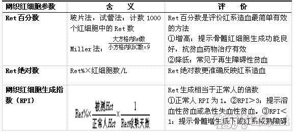 (二)臨床意義:網(wǎng)織紅細(xì)胞計(jì)數(shù)是反映骨髓造血功能的重要指標(biāo),常見網(wǎng)織紅細(xì)胞參數(shù)及評(píng)價(jià)。