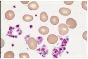 (2)血小板衛(wèi)星現(xiàn)象:血小板黏附、圍繞于中性粒細(xì)胞(或偶爾黏附于單核細(xì)胞)的現(xiàn)象,有時(shí)可見(jiàn)血小板吞噬現(xiàn)象。此時(shí),血小板和中性粒細(xì)胞形態(tài)和功能均正常。血小板衛(wèi)星現(xiàn)象偶見(jiàn)于EDTA抗凝血,因EDTA和免疫球蛋白相互作用、非特異性結(jié)合血小板之故,被抗體包被的血小板與中性粒細(xì)胞結(jié)合。血小板衛(wèi)星現(xiàn)象是血液分析儀血小板計(jì)數(shù)假性減少的原因之一(血小板被誤計(jì)為白細(xì)胞數(shù))。