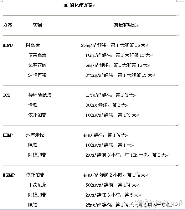 目前認(rèn)為HL最佳的治療方案是Ⅰ、Ⅱ期4~6周的ABVD方案聯(lián)合20~30Gy的受累野照射治療;Ⅲ、Ⅳ期6~8周的ABVD方案同時聯(lián)合放療。