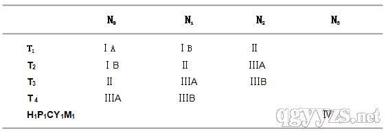 表中Ⅳ期胃癌包括如下幾種情況:N3淋巴結(jié)有轉(zhuǎn)移、肝臟有轉(zhuǎn)移H1、腹膜有轉(zhuǎn)移P1、腹腔脫落細(xì)胞檢查陽性CY1和其他遠(yuǎn)隔轉(zhuǎn)移M 1,包括胃周以外的淋巴結(jié)、肺臟、胸膜、骨髓、骨、腦、腦脊膜、皮膚等。