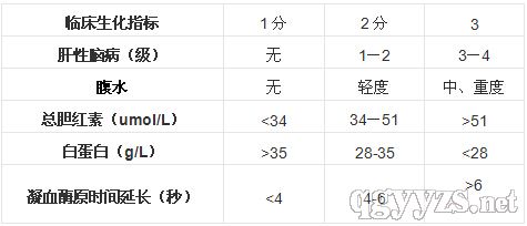 四、診斷要點:總之,脾腫大、側支循環(huán)的建立和開放、腹水是門靜脈高壓癥的三大臨床表現(xiàn),尤其是側支循環(huán)的建立和開放對門靜脈高壓的診斷有特征性意義。Child分級:門靜脈高壓癥患者的手術死亡率與其肝功能代償狀態(tài)有密切的關系。Child將肝硬化患者的肝功能根據(jù)臨床和實驗室檢查分為3級。其中A、B級的手術死亡率明顯低于C級,治療效果較好。其具體分級標準如下表: