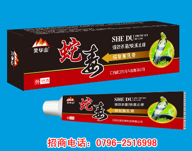 | 【主要成份】 | 蛇毒酶2.5%(w/w)、蛇油22.5%(w/w)、土茯苓3.0%(w/w)、苦參1.5%(w/w)、硫磺1.5%(w/w)、冰片1.5%(w/w)、薄荷腦2.0%(w/w)凡士林2.25%(w/w)等 |