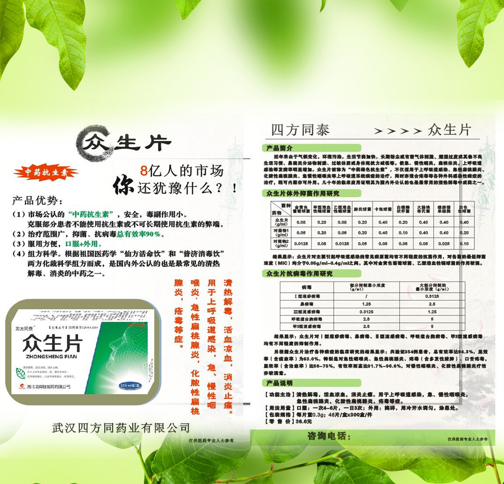 | 【產(chǎn)品賣點】 | 1.2008年國家新批文,全國僅二家生產(chǎn),區(qū)域醫(yī)保品種 2.清熱、解毒、消炎、止痛四效合一,一盒解決流感及**炎癥問題 3.實行產(chǎn)品小包裝區(qū)域編碼制,維護各區(qū)域代理權 4.四季暢銷,適合臨床、終端、診所等**渠道操作 5.提供各類物料支持,如單品彩頁,餐巾紙,圓珠筆等 |