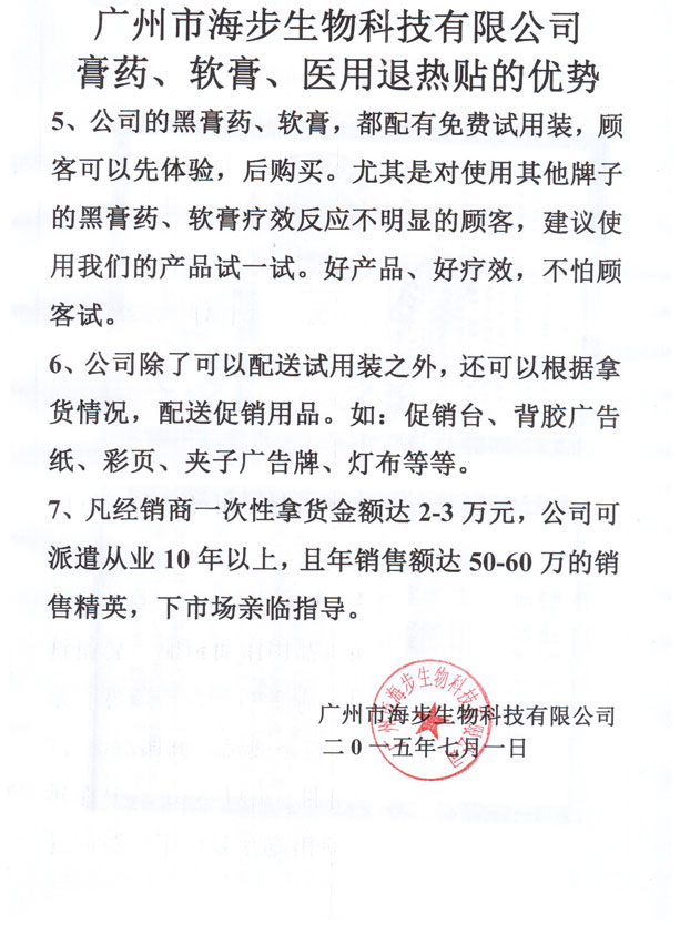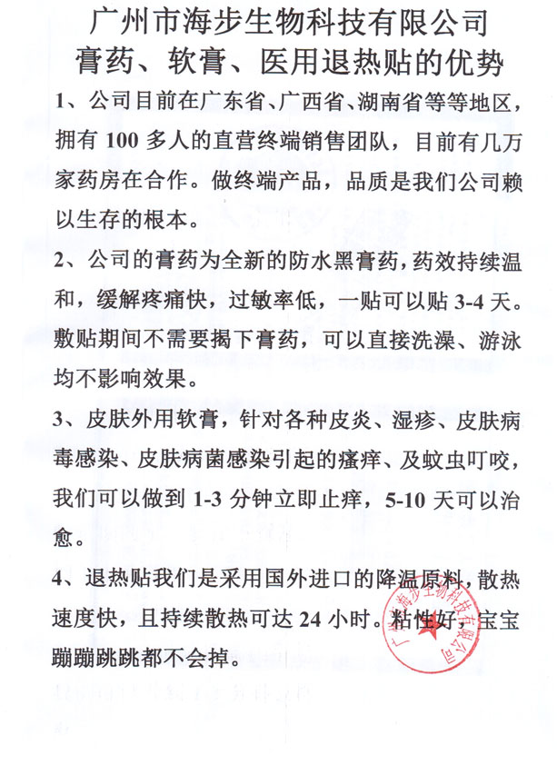 廣州市海步生物科技有限公司是一家集生物醫(yī)藥技術(shù)、功能性化妝品研發(fā)拓展銷售為一體的朝陽企業(yè)。公司以“海步產(chǎn)品,必是精品”為使命,堅(jiān)持以科技作為競爭力,密切追蹤世界先進(jìn)生物技術(shù)工程,致力于現(xiàn)代高新生物技術(shù)的研究和應(yīng)用。公司自成立以來,與多家**高校權(quán)威科研機(jī)構(gòu)合作,不斷提升產(chǎn)品的創(chuàng)新能力,把科學(xué)技術(shù)轉(zhuǎn)化為生產(chǎn)力。目前市場銷售的膏貼、外用皮膚病系列產(chǎn)品,品質(zhì)先絕,回頭客多,深受客戶的親睞與消費(fèi)者的認(rèn)可,不但形成了一定的顧客忠誠度,同時(shí)也成就了一批市場精英。