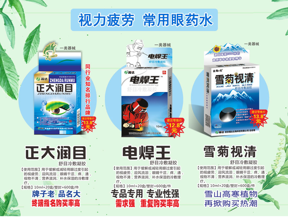 西安福達(dá)生物科技有限公司,地處于十三朝古都?xì)v史名城-西安。多年來,公司不斷自我完善發(fā)展,在濃郁的保健品文化中配合西方管理先進(jìn)理念,秉承健康、衛(wèi)生、誠信創(chuàng)新的企業(yè)文化,使公司發(fā)展成為集產(chǎn)銷為一體的系列化、多元化保健食品企業(yè)。具有完善的銷售網(wǎng)絡(luò)體系的規(guī)模品牌,不斷致力于提高產(chǎn)品質(zhì)量和技術(shù),以顧客滿意為目標(biāo),不斷進(jìn)行產(chǎn)品創(chuàng)新,營銷創(chuàng)新、管理模式創(chuàng)新作為公司的發(fā)展源泉。今日的西安福達(dá),始終不忘產(chǎn)品質(zhì)量的目標(biāo),提高企業(yè)知名度,規(guī)范公司的管理,著力提升產(chǎn)品的市場競爭力,走健康+誠信的品牌之路。西安福達(dá)生物科技有限公司主營:一類器械號(hào),消毒產(chǎn)品,眼藥水、眼貼、鼻炎噴劑,婦科凝膠、暈車貼、漱口水、蘆薈膠、雞眼貼、口噴、鼻風(fēng)濕骨病、皮膚凝膠等系列產(chǎn)品近百余種;合作醫(yī)藥公司、連鎖藥店多達(dá)2000家。 隨著社會(huì)經(jīng)濟(jì)的突飛猛進(jìn),為擴(kuò)大企業(yè)的多樣化銷售渠道,熱情歡迎社會(huì)各界經(jīng)濟(jì)精英前來進(jìn)行(產(chǎn)品貼牌和密切合作)銷售、探討新產(chǎn)品與新市場的潛在機(jī)會(huì)。 公司恪守“以名律己,以實(shí)惠人”的企業(yè)理念,誠征各地市代理經(jīng)銷、合作商。