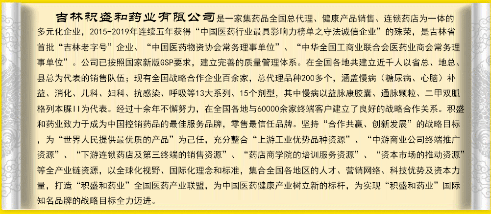 吉林積盛和藥業(yè)有限公司是一家集藥品全國總代理、健康產(chǎn)品銷售、連鎖藥店為一體的多元化企業(yè),2015-2019年連續(xù)五年獲得“中國醫(yī)藥行業(yè)*具影響力榜單之守法誠信企業(yè)”的殊榮,是吉林省首批“吉林***”企業(yè)、“中國醫(yī)藥物資協(xié)會常務(wù)理事單位”、“中華全國工商業(yè)聯(lián)合會醫(yī)藥業(yè)商會常務(wù)理事單位”。公司已按照國家新版GSP要求,建立完善的質(zhì)量管理體系。在全國各地共建立近千人以省總、地總、縣總為代表的銷售隊(duì)伍;現(xiàn)有全國戰(zhàn)略合作企業(yè)百余家,總代理品種200多個,涵蓋慢。ㄌ悄虿、心腦)補(bǔ)益、消化、兒科、婦科、抗感染、呼吸等13大系列、15個劑型,其中慢病以益脈康膠囊、通脈顆粒、二甲雙胍格列本脲II為代表。經(jīng)過十余年不懈努力,在全國各地與60000余家終端客戶建立了良好的戰(zhàn)略合作關(guān)系。積盛和藥業(yè)致力于成為中國控銷藥品的*佳服務(wù)品牌,零售*信任品牌。堅(jiān)持“合作共贏、創(chuàng)新發(fā)展”的戰(zhàn)略目標(biāo),為“世界人民提供*優(yōu)質(zhì)的產(chǎn)品”為己任,充分整合“上游工業(yè)優(yōu)勢品種資源”、“中游商業(yè)公司終端推廣資源”、“下游連鎖藥店及第三終端的銷售資源”、“藥店商學(xué)院的培訓(xùn)服務(wù)資源”、“資本市場的推動資源”等全產(chǎn)業(yè)鏈資源,以全球化視野、國際化理念和標(biāo)準(zhǔn),集合全國各地區(qū)的人才、營銷網(wǎng)絡(luò)、科技優(yōu)勢及資本力量,打造“積盛和藥業(yè)”全國醫(yī)藥產(chǎn)業(yè)聯(lián)盟,為中國醫(yī)藥健康產(chǎn)業(yè)樹立新的標(biāo)桿,為實(shí)現(xiàn)“積盛和藥業(yè)”國際知名品牌的戰(zhàn)略目標(biāo)全力邁進(jìn)。