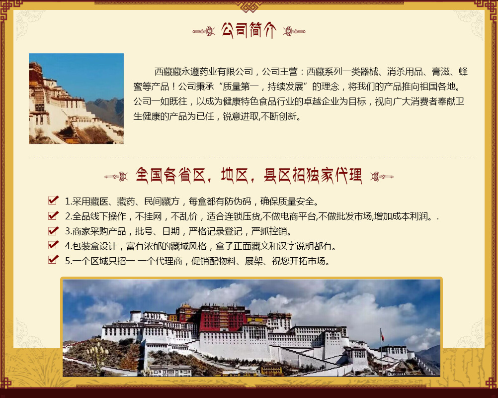 西藏藏永遵藥業(yè)有限公司產(chǎn)品展臺 技術(shù)支持:環(huán)球醫(yī)藥招商網(wǎng) (招商頻道-醫(yī)藥代理-otc-處方藥) 版權(quán)所有,違版必究