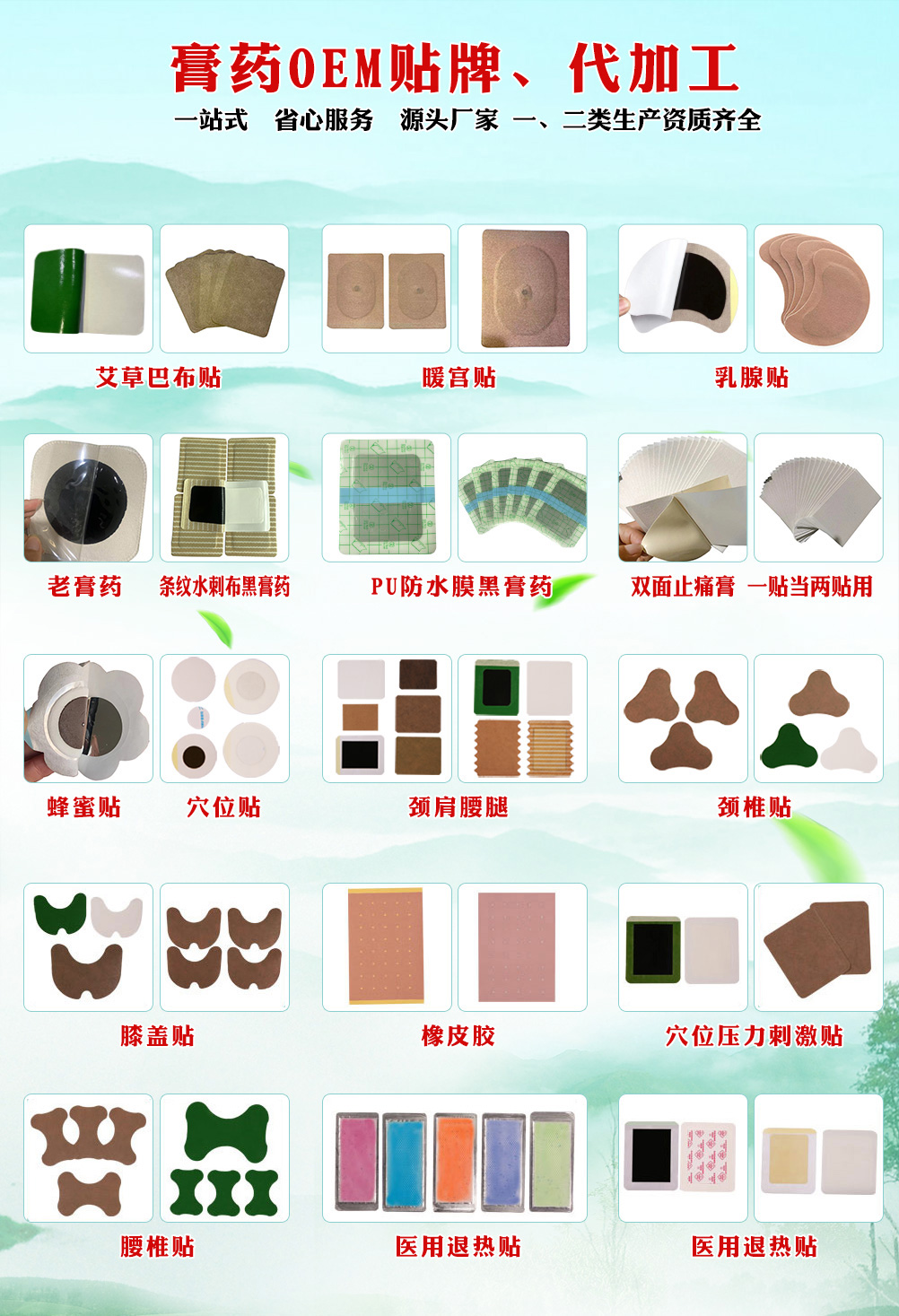 公司主要生產(chǎn)一類、二類醫(yī)療器械、凝膠產(chǎn)品、噴劑敷料、醫(yī)用耗材等。產(chǎn)品系列包括彈力布、水刺布、無(wú)紡布、手工膏藥、疼痛類貼劑、婦科類貼劑、兒科類貼劑、日常保健類等。提供 OEM 貼牌代加工、大包、代理等服務(wù)。手續(xù)資質(zhì)齊全,現(xiàn)代化專業(yè)生產(chǎn),貼膏流水線車間的規(guī)模企業(yè)。公司產(chǎn)品 100 多種任您挑選。公司產(chǎn)品銷往全國(guó)各地,深受消費(fèi)者青睞。 公司貫徹“品質(zhì)**,服務(wù)至上”的原則,攜手每一位客戶打造健康產(chǎn)品!