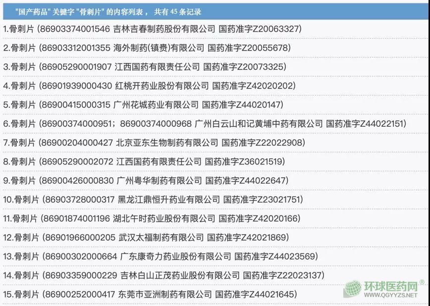 據(jù)賽柏藍在藥監(jiān)局官網(wǎng)查詢,骨刺片共有國產(chǎn)藥品批文45條。其中包括和記黃埔、紅桃開藥業(yè)、南京同仁堂藥業(yè)、亞寶藥業(yè)、葵花藥業(yè)等知名藥企都有批文。