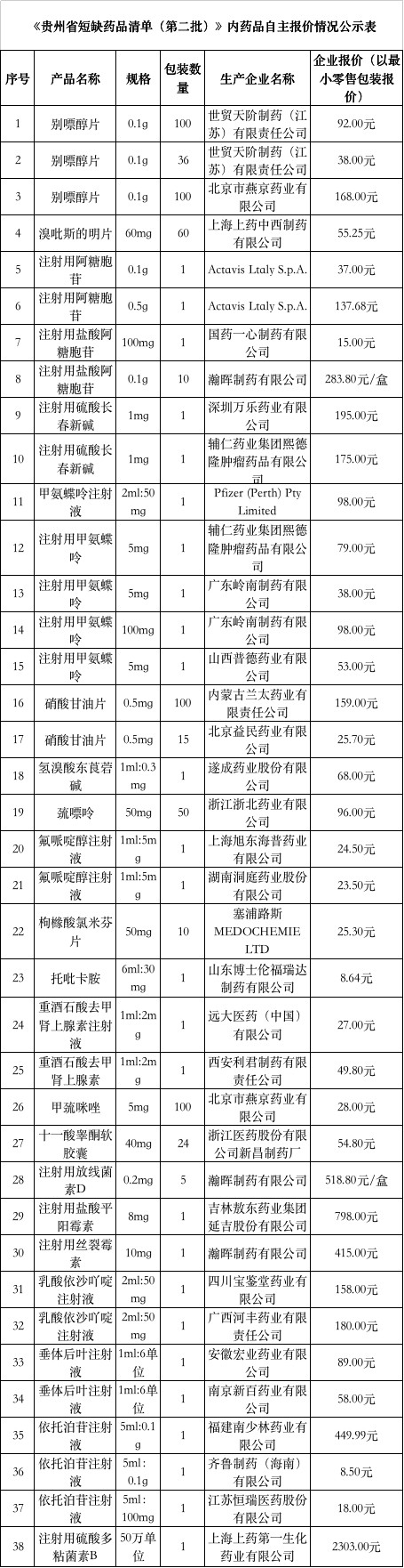 據(jù)《通知》,《貴州省短缺藥品清單(第二批)》內(nèi)藥品掛網(wǎng)采購價格自主申報(bào)工作已完成,現(xiàn)公示企業(yè)自主報(bào)價情況,公示時間為3個工作日,10月17日17:00截止。