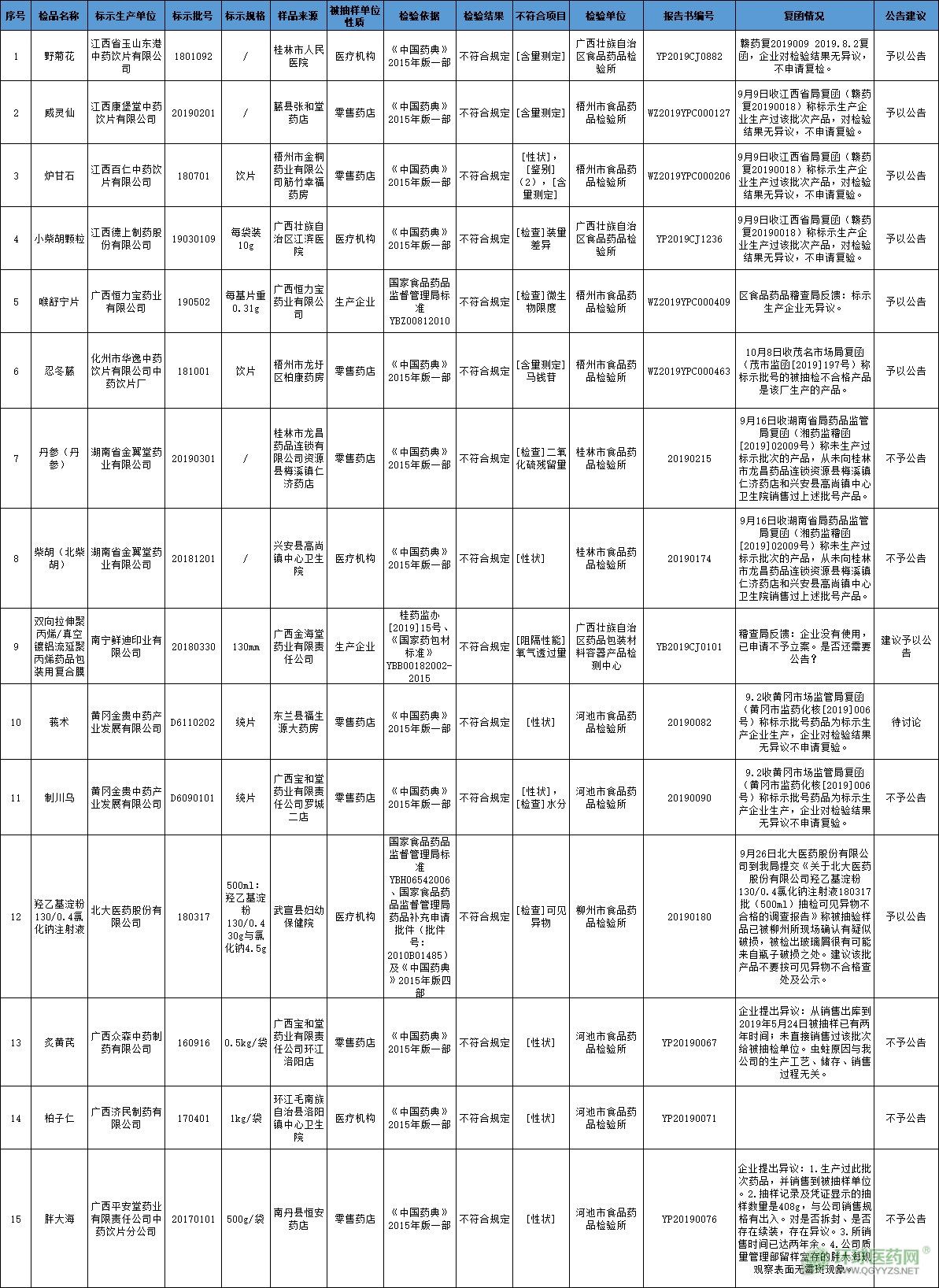 14號(hào),廣西藥監(jiān)局官網(wǎng)發(fā)布《廣西壯族自治區(qū)藥品監(jiān)督管理局藥品質(zhì)量公告》 (2019年第7期)2019年公告第16號(hào),一批常見(jiàn)藥被查不合格,涉及爐甘石、小柴胡顆粒等暢銷(xiāo)藥...