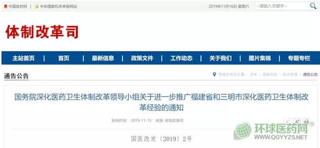11月15日,國(guó)家衛(wèi)健委發(fā)布了《關(guān)于進(jìn)一步推廣福建省和三明市深化醫(yī)藥衛(wèi)生體制改革經(jīng)驗(yàn)的通知》(以下簡(jiǎn)稱(chēng)“通知”)。