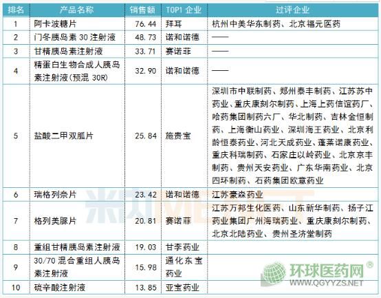 表1:2018年中國公立醫(yī)療機構(gòu)終端糖尿病用藥產(chǎn)品TOP10(單位:億元)