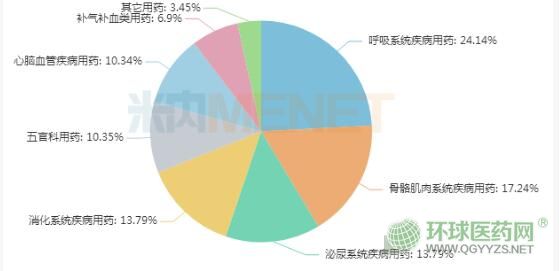 從治療類別看,29個(gè)獨(dú)家中成藥涵蓋8個(gè)治療大類,呼吸系統(tǒng)疾病用藥獨(dú)占鰲頭,占比達(dá)24.14%,骨骼肌肉系統(tǒng)疾病用藥以17.24%的占比緊接其后,泌尿系統(tǒng)疾病用藥、消化系統(tǒng)疾病用藥以13.79%的占比并列第三。
