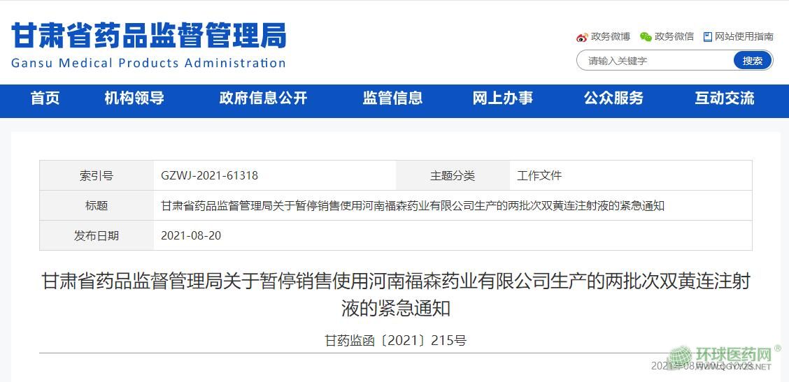 8月20日,甘肅省藥品監(jiān)督管理局發(fā)布通知,要求暫停銷(xiāo)售使用河南福森藥業(yè)有限公司生產(chǎn)的兩批次雙黃連注射液。
