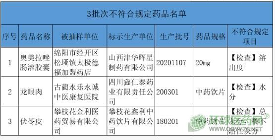 在這些不合格藥品中,一種為制劑,為奧美拉唑腸溶膠囊;另外兩種為中藥飲片,分別為龍眼肉、伏苓皮。具體如下圖: