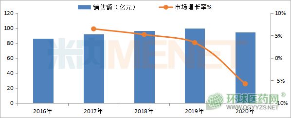 2016-2020年我國泌尿系統(tǒng)感染藥物市場銷售額及成長性