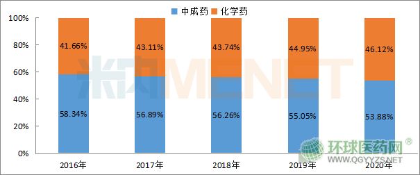 2016年至2020年我國泌尿系統(tǒng)感染用藥市場總體以中成藥為主,占比保持在五成以上,化學(xué)藥在五成以下。但根據(jù)發(fā)展趨勢看,有走向“二一添作五”的趨勢,由于化學(xué)藥總體增速要優(yōu)于中成藥,因此化學(xué)藥市場份額呈現(xiàn)逐年上升之勢,中成藥市場份額呈下滑之勢。