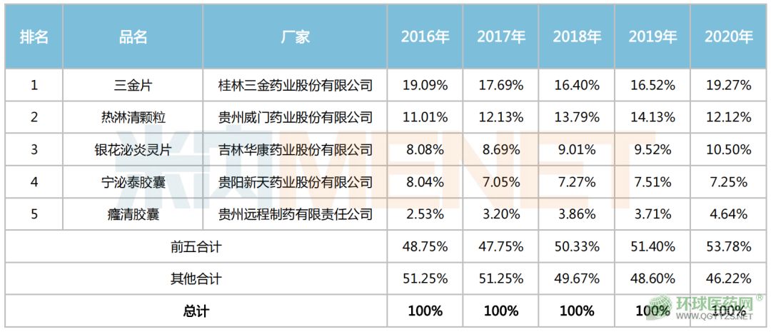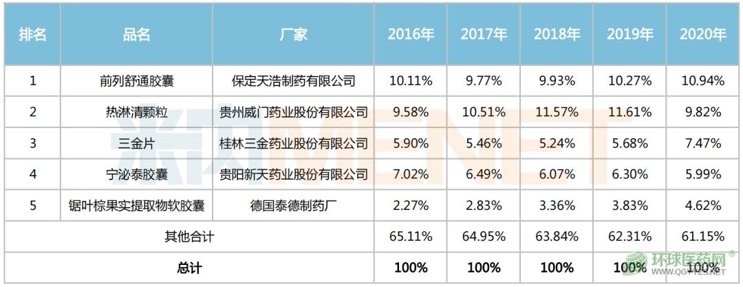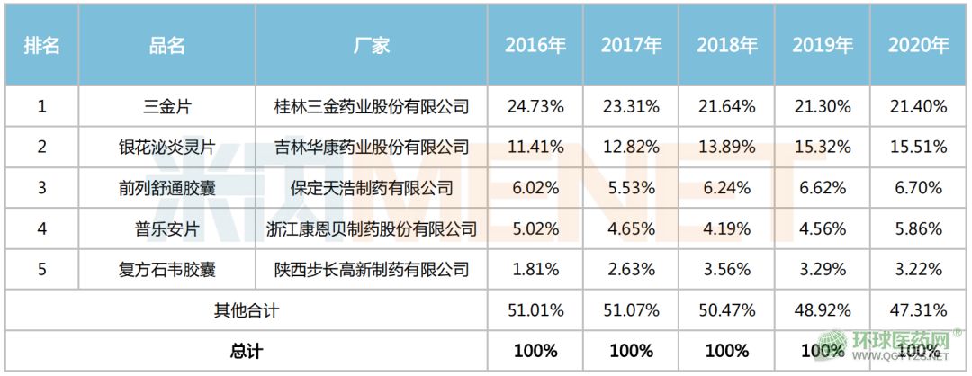 近年來,我國泌尿系統(tǒng)疾病患病率翻倍增長,泌尿系統(tǒng)感染藥物的市場規(guī)模達(dá)到近百億元級別。2016-2020年,中成藥在泌尿系統(tǒng)感染用藥的市場份額均超53%,院內(nèi)及藥店終端市場都有大品牌處方藥的身影,三金片、熱淋清顆粒等常年高居榜單前列。尿路感染中成藥市場保持穩(wěn)健發(fā)展,TOP5品牌市占率穩(wěn)中帶升。