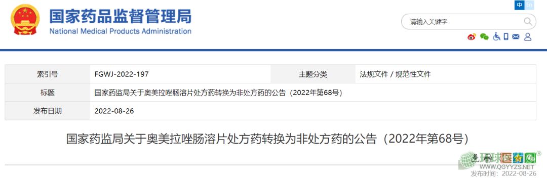8月26日,國家藥監(jiān)局網(wǎng)站發(fā)布關(guān)于奧美拉唑腸溶片處方藥轉(zhuǎn)換為非處方藥的公告。