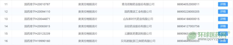 經(jīng)查詢國家藥監(jiān)局網(wǎng)站,目前國內(nèi)共有16個奧美拉唑腸溶片生產(chǎn)批文,我國境內(nèi)主要生產(chǎn)廠家有:辰欣藥業(yè)股份有限公司、青島雙鯨藥業(yè)股份有限公司等。