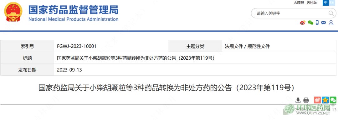 2023年09月13日,國(guó)家藥監(jiān)局發(fā)布了3種藥品轉(zhuǎn)換為非處方藥的公告,涉及小柴胡顆粒、高山紅景天口服液和眾生片3個(gè)品種,要求上市許可持有人在2024年6月5日前完成說(shuō)明書事項(xiàng)備案工作。
