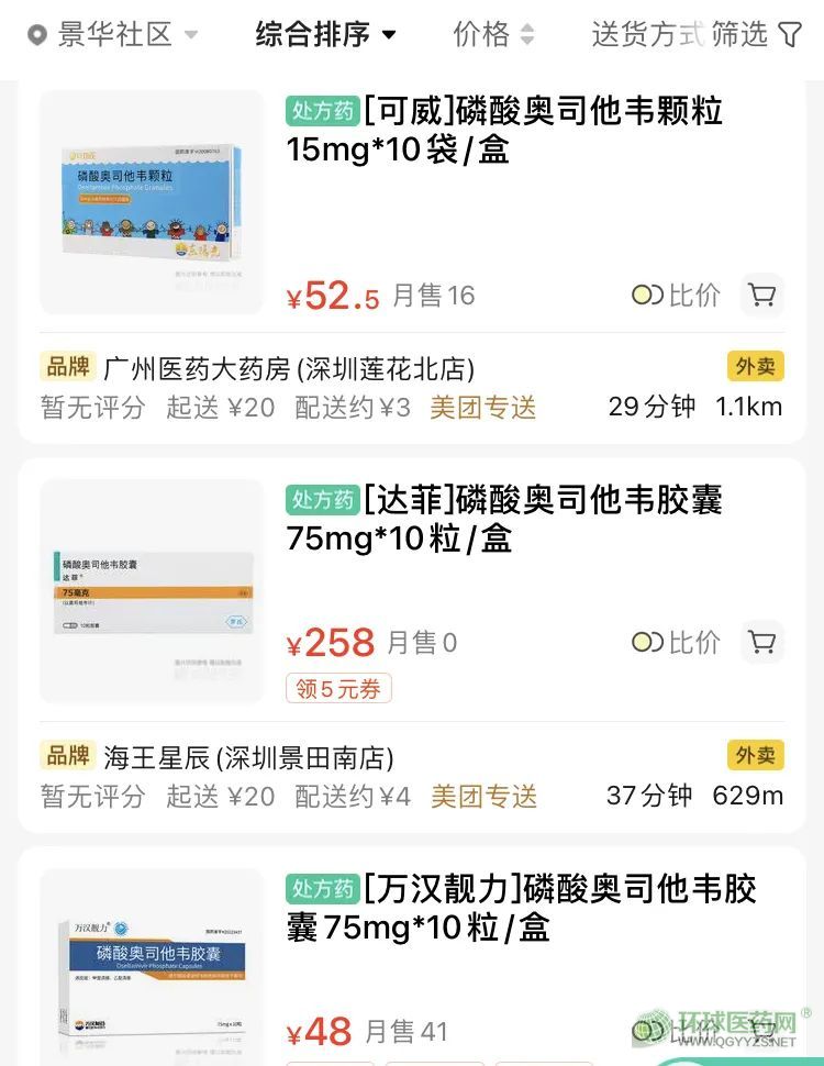 “美團(tuán)買藥”平臺(tái)顯示,奧司他韋不同產(chǎn)品價(jià)格不一。