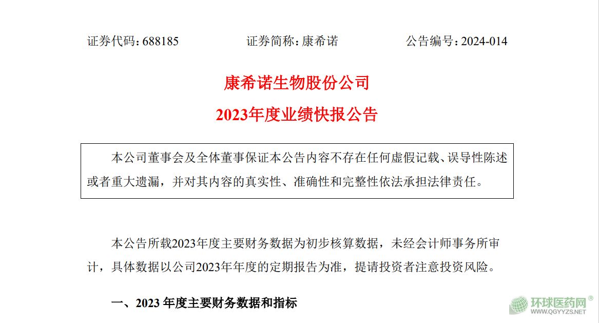 2023年2月24日,康希諾發(fā)布業(yè)績快報,2023年營業(yè)總收入3.57億元,同比下降65.49%;歸母凈虧損14.47億元;