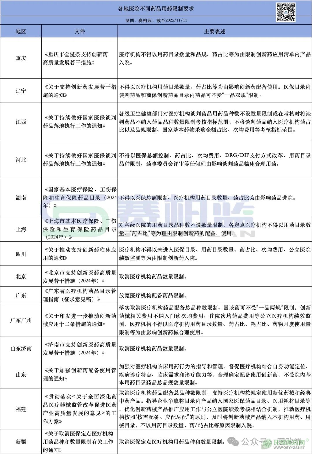 11月初,重慶市人民政府辦公廳印發(fā)《重慶市全鏈條支持創(chuàng)新藥高質(zhì)量發(fā)展若干措施》的通知提到,醫(yī)療機(jī)構(gòu)不得以用藥目錄數(shù)量和品規(guī)、藥占比等為由限制創(chuàng)新藥應(yīng)用清單內(nèi)產(chǎn)品入院。