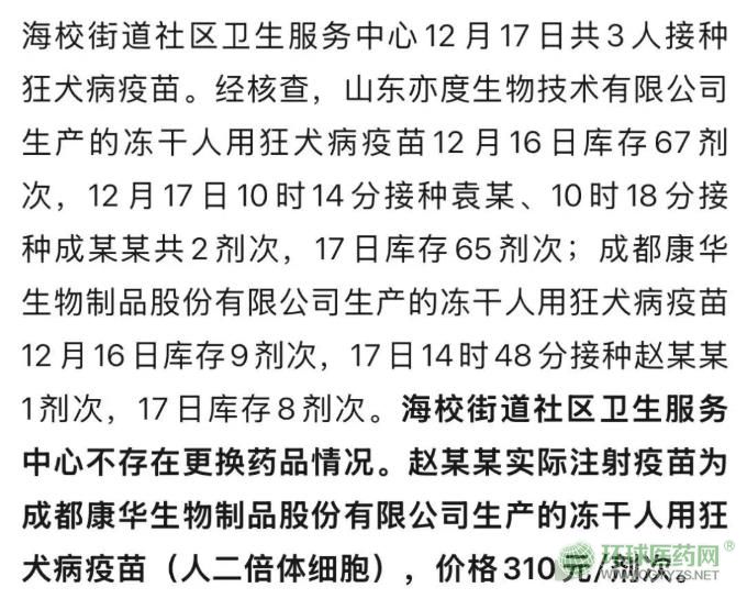 一、調(diào)查情況經(jīng)調(diào)查,12月17日14時(shí)28分,趙某某因被狗咬后到海校街道社區(qū)衛(wèi)生服務(wù)中心就診,門診醫(yī)生為趙某某開具成都康華生物制品股份有限公司生產(chǎn)的凍干人用狂犬病疫苗(人二倍體細(xì)胞),310元/劑次。