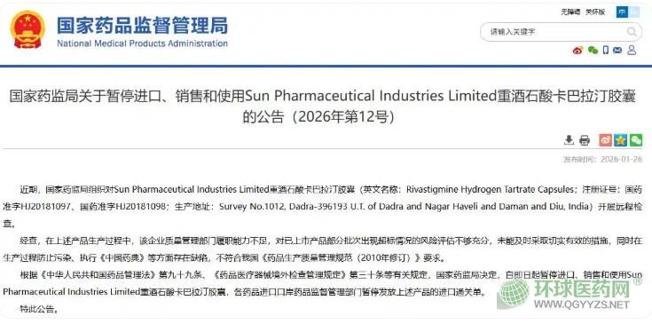 紅星資本局1月28日消息,1月26日,國家藥監(jiān)局發(fā)布了關于暫停進口、銷售和使用兩款藥物的消息,這兩款藥物均為印度廠家所生產(chǎn),分別是Sun Pharmaceutical Industries Limited(印度太陽制藥工業(yè)有限公司,簡稱“太陽制藥”)的重酒石酸卡巴拉汀膠囊以及Supriya Lifescience Ltd.的馬來酸氯苯那敏原料藥。
