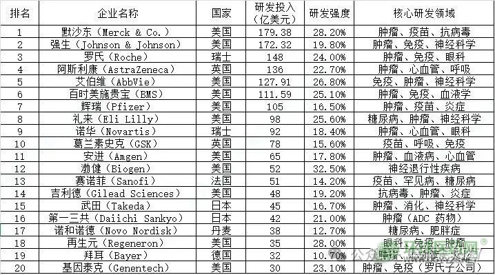 以下是世界排名前20的藥企2024年全年研發(fā)投入:
