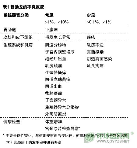 該部分內容囊括了 21 項安慰劑空白對照研究(包括 LIFT 研究)中所記錄的不良反應,在這些研究中有 4079 名女性受試者接受了治療劑量的替勃龍(1.25 mg 或 2.5 mg)治療,3476 名女性受試者接受了安慰劑的治療。這些研究的治療期在 2 個月~4.5 年不等。表 1 列出替勃龍治療組與安慰劑對照組之間具有統(tǒng)計學差異的不良反應。