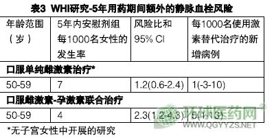 激素替代治療與靜脈血栓栓塞(VIE,即深靜脈血栓或肺栓塞)相對風險發(fā)生增加 1.3-3 倍有關。該類事件的發(fā)生更可能見于使用激素替代治療的第一年(見【注意事項】)。女性健康倡議(WHI)研究結果如下所示: