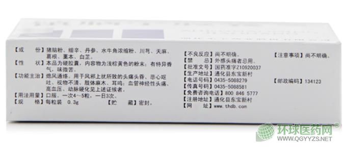 【成分】豬腦粉、細(xì)辛、丹參、水牛角濃縮粉、川芎、天麻、葛根、藁本、白芷。