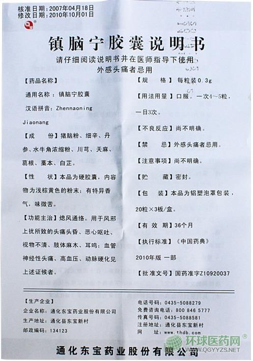東寶鎮(zhèn)腦寧膠囊說明書(2010年版)