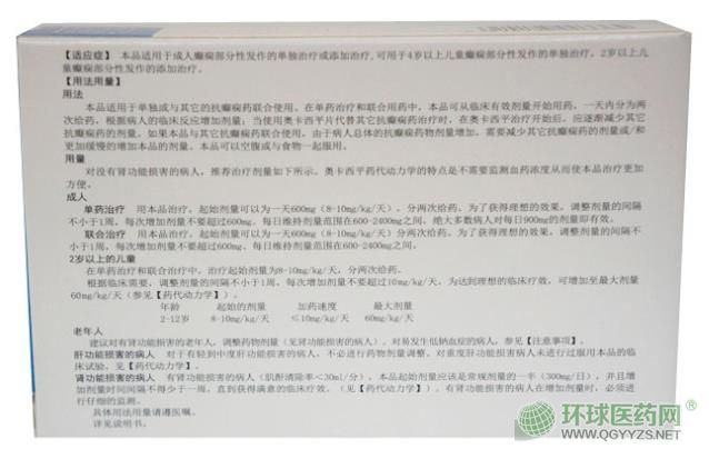 用法:本品適合于單獨(dú)或與其它的抗癲癇藥聯(lián)合使用。在單獨(dú)治療和聯(lián)合用藥中,本品可從臨床有效劑量開(kāi)始用藥,一天內(nèi)分兩次給藥,根據(jù)病人的臨床反應(yīng)增加劑量;當(dāng)使用奧卡西平代替其他抗癲癇藥治療時(shí),在奧卡西平治療開(kāi)始后,應(yīng)逐漸減少其他抗癲癇藥的劑量。如果本品與其他抗癲癇藥聯(lián)合使用,由于病人總體的抗癲癇藥物劑量的增加,需要減少其它抗癲癇藥的劑量或/和更加緩慢的增加本品的劑量。 本品可以空腹或與食物一起服用。 用量:對(duì)沒(méi)有腎功能損害的病人,推薦治療劑量如說(shuō)明書(shū)所示。奧卡西平藥代動(dòng)力學(xué)的特點(diǎn)是不需要監(jiān)測(cè)血藥濃度從而使本品治療更加方便。